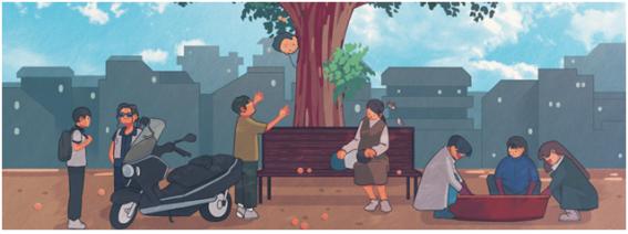 Q. 아버지와 아들은 공립도서관에서 따로 또 같이 하루를 보내는데요. 이 공간에서 어떤 영감을 받으셨나요? 살구나무로 설정한 이유도 궁금합니다.