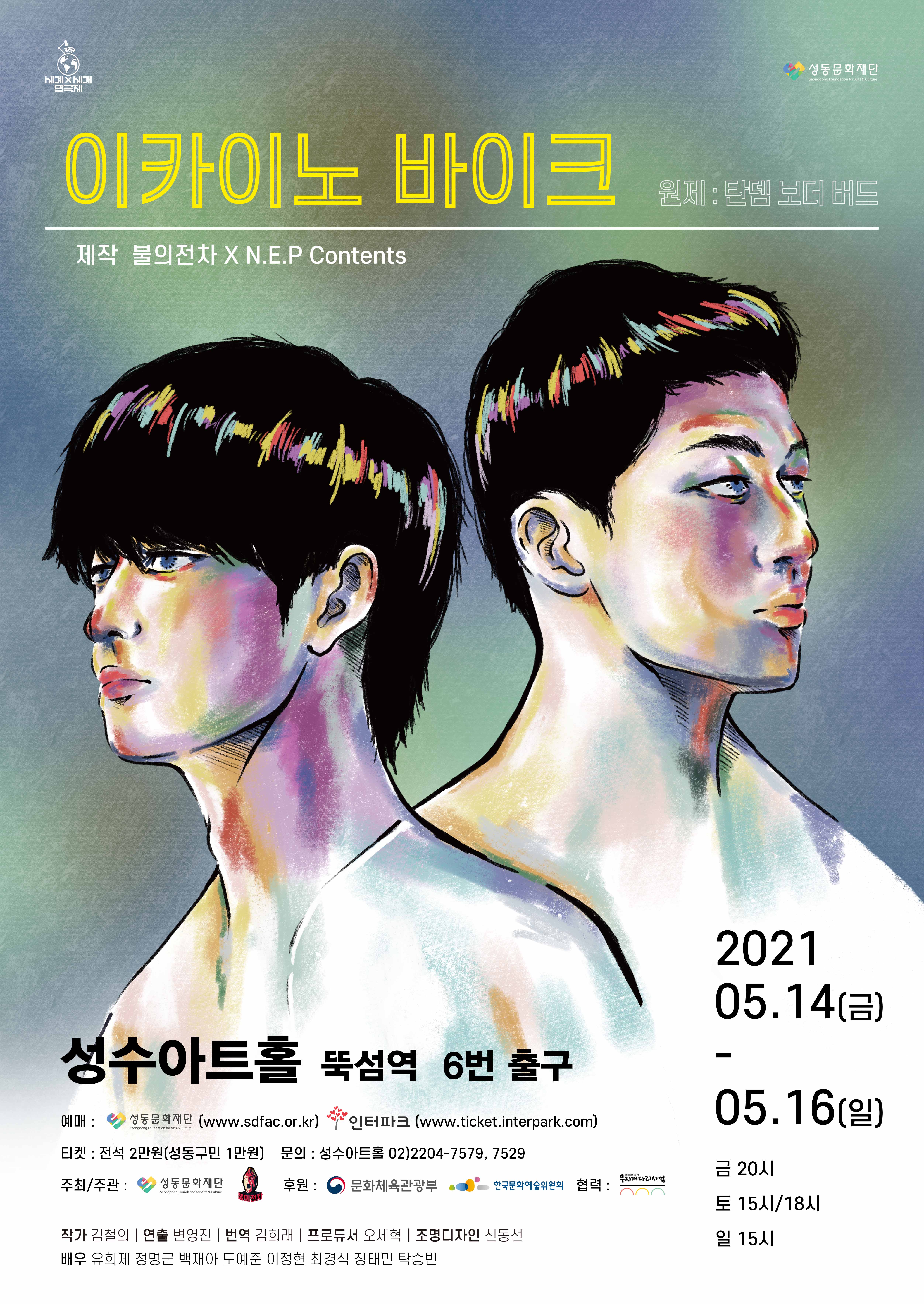 두 번째 작품 '이카이노 바이크'의 원제는 '탄뎀 보더 버드'이며, 재일 동포 3세 연극인 김철의가 집필한 희곡이다. 지난해‘간사이 연극제’에서 최우수 작품상, 연출상을 수상하기도 했다. 가까이 있으나 결코 가까이 있지 않은‘조선적’재일 동포의 삶과 그들 가슴에 세대를 거쳐 뿌리내린 국경의 의미를 담고 있는 '이카이노 바이크' 는 5월 14일(금)부터 16일(일)까지 성수아트홀에서 진행된다.