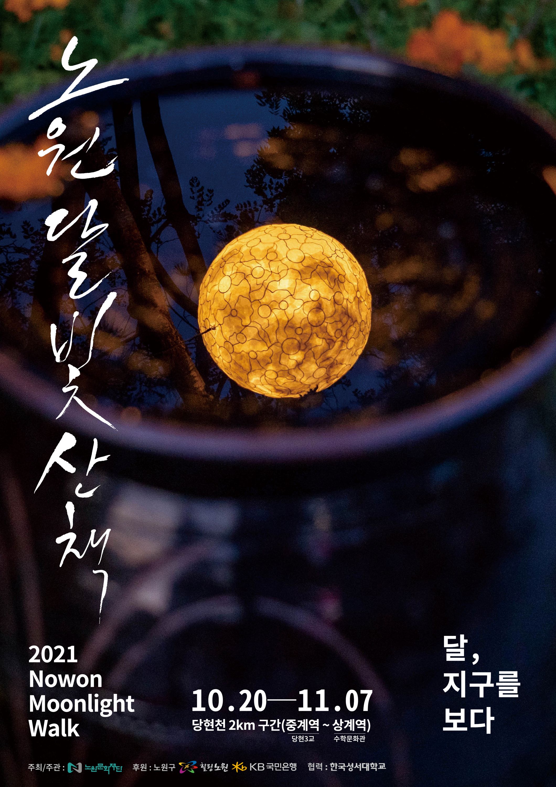 노원문화재단(이사장 김승국)은 10월 20일(수)부터 11월 7일(일)까지 19일간 중계역~상계역 사이 당현천(약 2㎞ 구간)에서 2021 노원달빛산책을 개최한다고 밝혔다. 노원달빛산책은 2020년 18만명의 관람객이 다녀갈 정도로 큰 관심을 받았다.