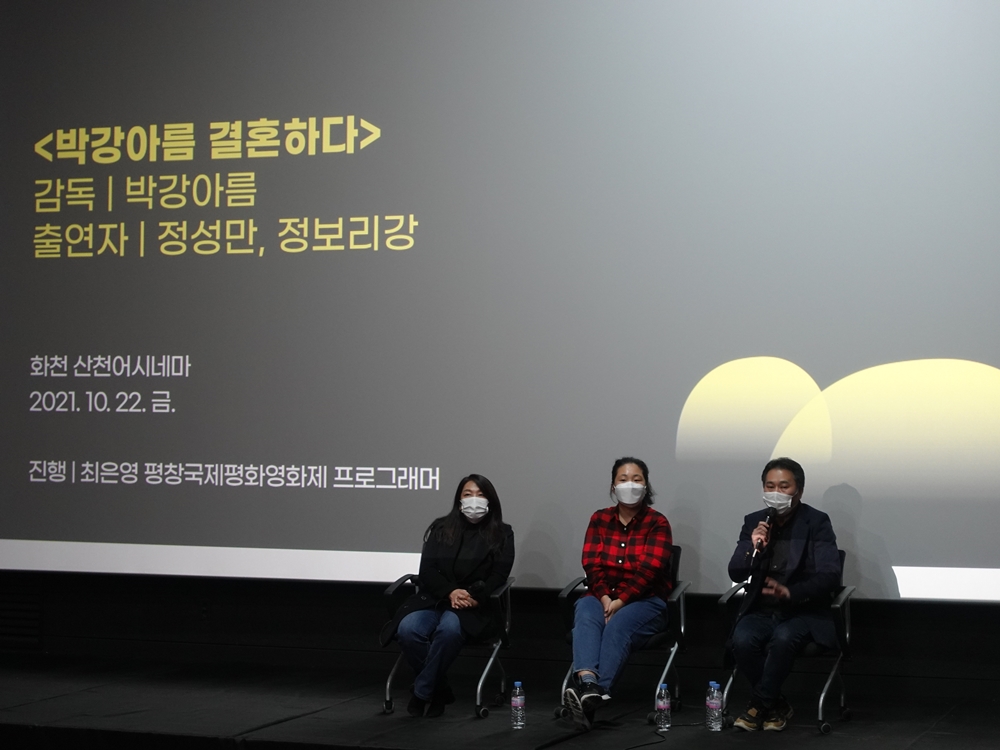 '박강아름결혼하다'는프랑스유학생활중프랑스어를할줄아는아내가행정과경제를맡고, 프랑스어를전혀할줄모르는남편이가사와육아를맡으며전통적젠더역할을유쾌하게뒤집은영화. 화천에서만난영화속세배우에게관객들의질문이쏟아졌다.