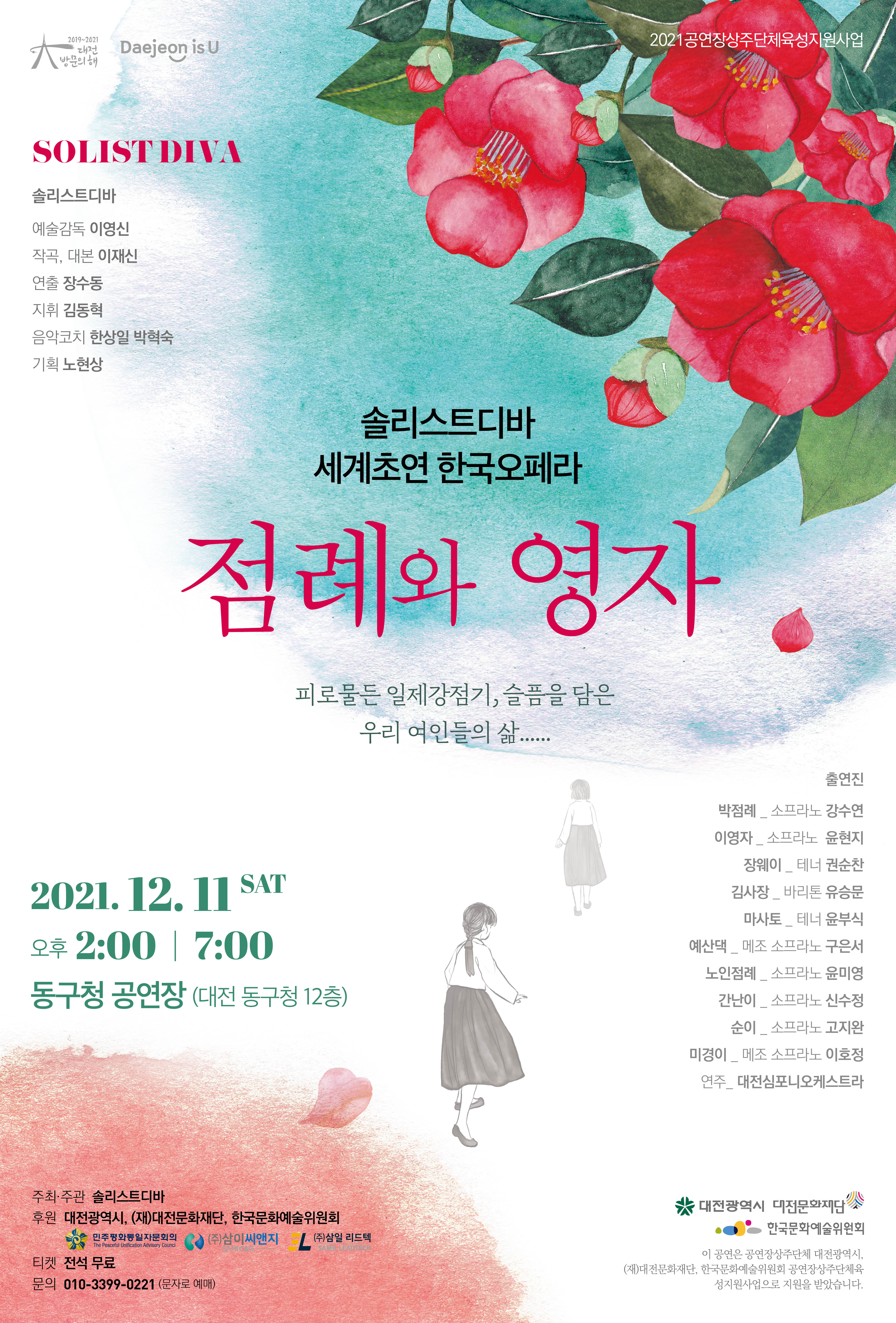 [플레이뉴스 박순영기자] 솔리스트디바 세계초연 이재신오페라 <점례와 영자>가 12월 11일 오후 2시와 7시 대전 동구청 공연장에서 공연된다. 한일관계의 위안부 문제를 소녀상 제막식을 배경으로 다룬 오페라 <점례와 영자>는 작곡가 이재신이 대본과 작곡을 하고, 솔리스트 디바 이영신 단장이 예술감독을, 서울오페라앙상블 장수동 감독이 연출을 맡았다.