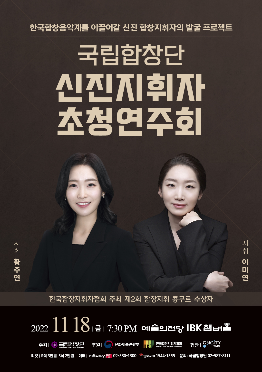 (재)국립합창단(단장 겸 예술감독 윤의중)은 2022년 11월 18일(금) 오후 7시 30분 예술의전당 IBK챔버홀에서 '신진지휘자 초청연주회'를 개최한다. 이번 초청연주 회는 올해 9월, 한국합창지휘자협회(KCDA, 이사장 민인기)가 주최한 제2회 합창지 휘 콩쿠르 수상자 황주연, 이미연이 객원 지휘자로서 국립합창단과 함께 선보이는 데뷔 무대다.