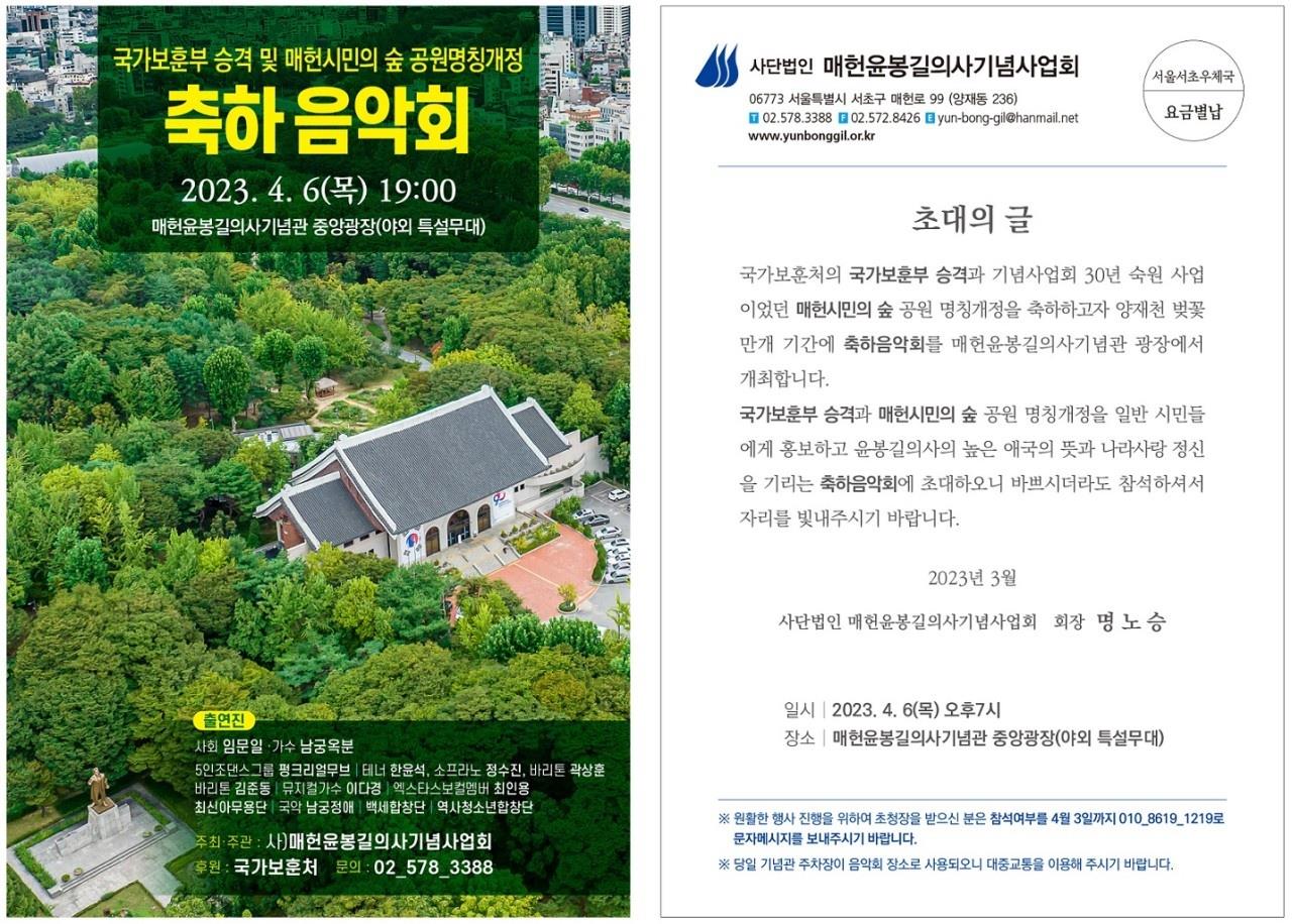 [플레이뉴스 문성식기자] ‘국가보훈부 승격’과 매헌윤봉길의사기념사업회 30년 숙원 사업인 ‘매헌시민의 숲’ 명칭 개정 축하음악회가 4월 6일 오후 7시부터 양재동 매헌시민의 숲에 위치한 매헌윤봉길의사기념관 야외광장에서 개최된다.