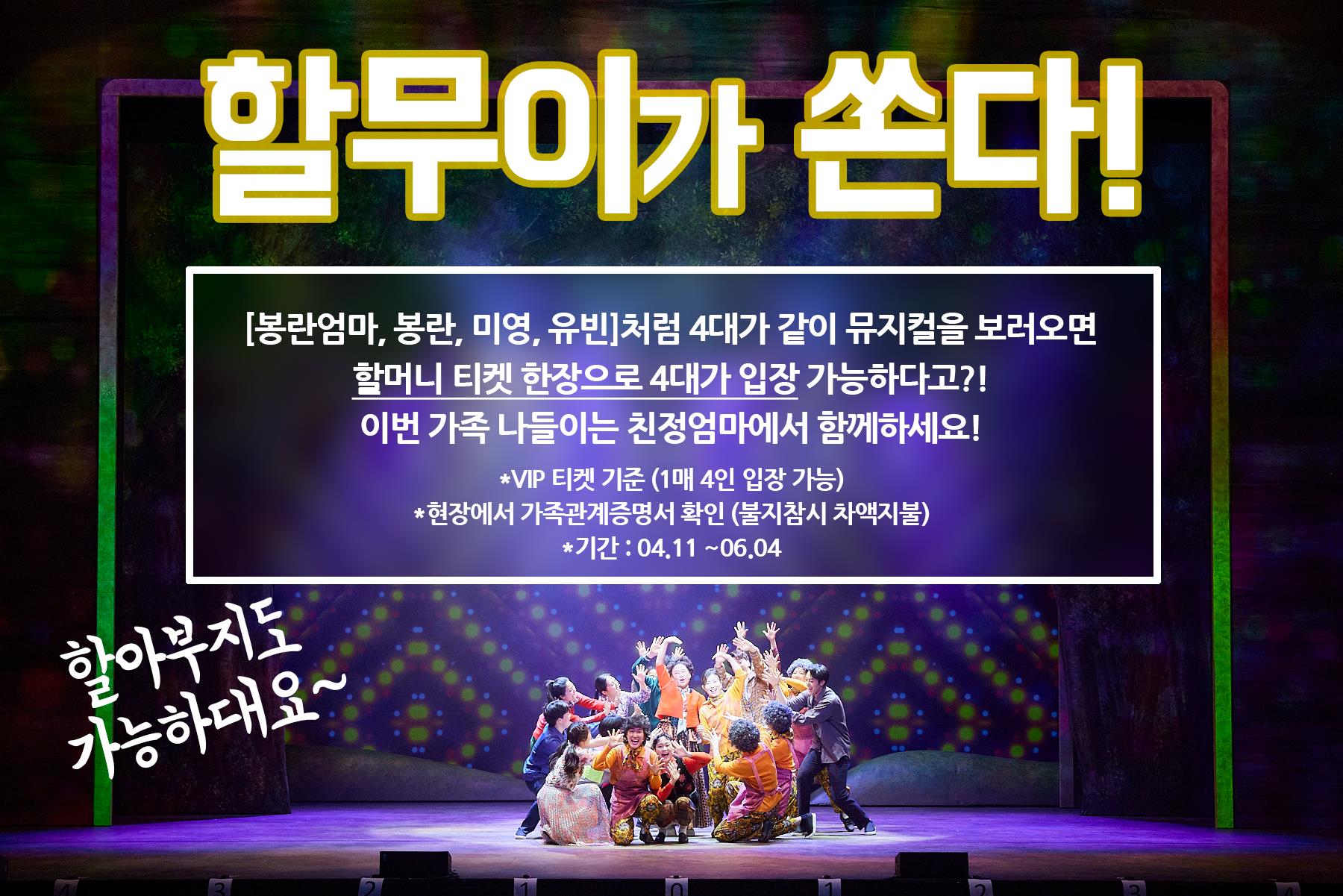 제작사 ㈜수키컴퍼니는 공식 SNS를 통해 “’봉란엄마, 봉란, 미영, 유빈’처럼 4대가 같이 뮤지컬을 보러오면 할머니 티켓 한 장으로 4대가 입장 가능!”이라는 안내문으로 가족 단위 관객들의 이목을 사로잡을 파격적인 혜택을 전했다.