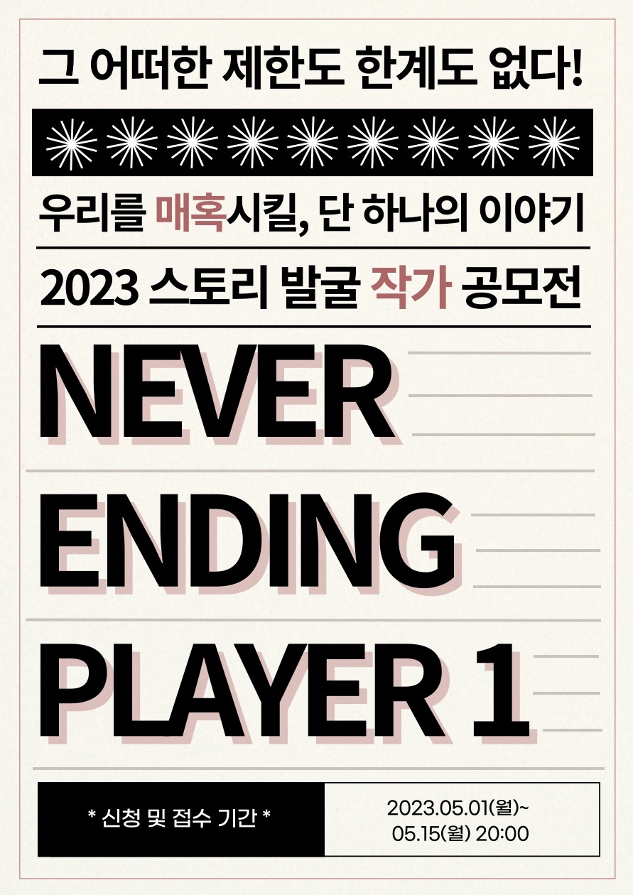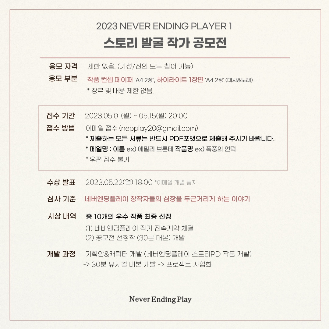 1일 네버엔딩플레이(대표 오세혁, 최종혁)는 “기존에 있던 기준이나 상황을 벗어나 자유로운 환경에서 창작된 작품들을 발굴하기 위해 ‘네버엔딩플레이 2023 스토리 발굴 공모전’을 개최하게 됐다”고 밝혔다. 응모작은 오늘(1일)부터 5월 15일까지 네버엔딩플레이 공식 이메일(nepplay20@gmail.com)을 통해 접수할 수 있다.