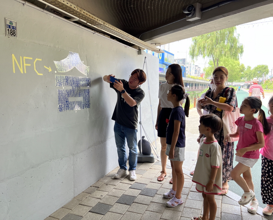 NFC 전시를 감상하는 참가자들 다리밑 ‘숨쉬고 싶다 물쉬고 싶다’ AR, NFC 전시