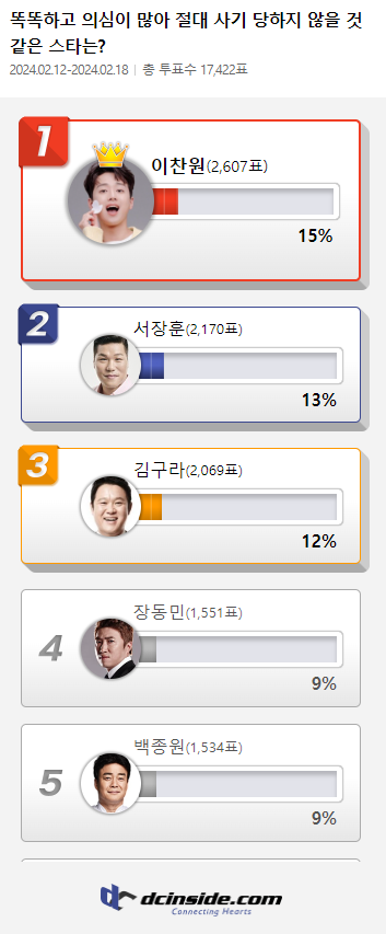 커뮤니티 포털사이트 디시인사이드(대표 김유식)가 `똑똑하고 의심이 많아 절대 사기 당하지 않을 것 같은 스타는?`으로 투표를 한 결과 이찬원이 1위에 올랐다. 이 투표는 지난 12일부터 18일까지 총 7일간 진행했다.