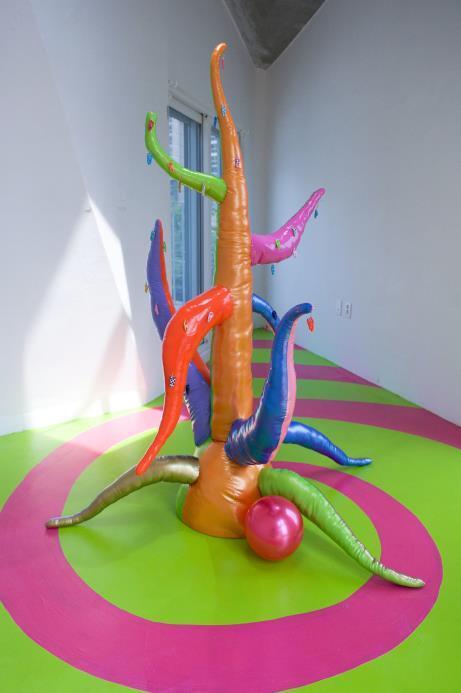 <아모 나무>, 2022, 원단.솜.나무, 155*106*190cm 작품설명: "아모 나무"는 작은 아모 귀걸이들이 피어 있는 나무이며 사람들의 선택을 받은 아모는 작은 집에 넣어진 채 입양되어 주인의 반려 친구가 될 수 있다는 내용의 작품이다. |