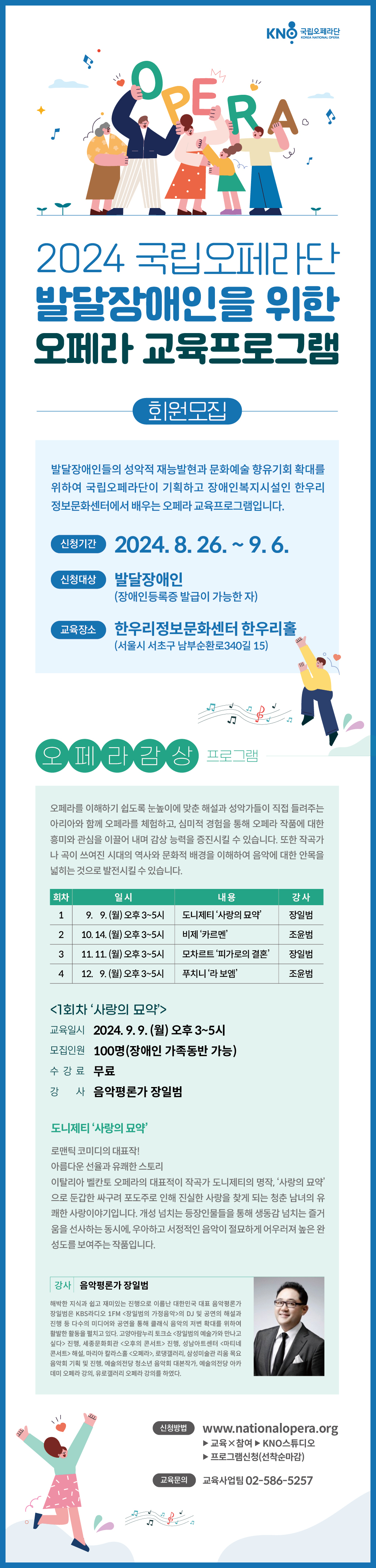 오는 9월 6일(금)까지 신청가능하며 장애인등록증 발급이 가능한 성인 발달장애인이라면 누구나 신청할 수 있다. 교육기간은 9월부터 12월까지로 참가자들은 총 4개월 동안 무료로 진행되는 이번 교육 프로그램을 통해 오페라와의 즐거운 만남을 이어나간다.