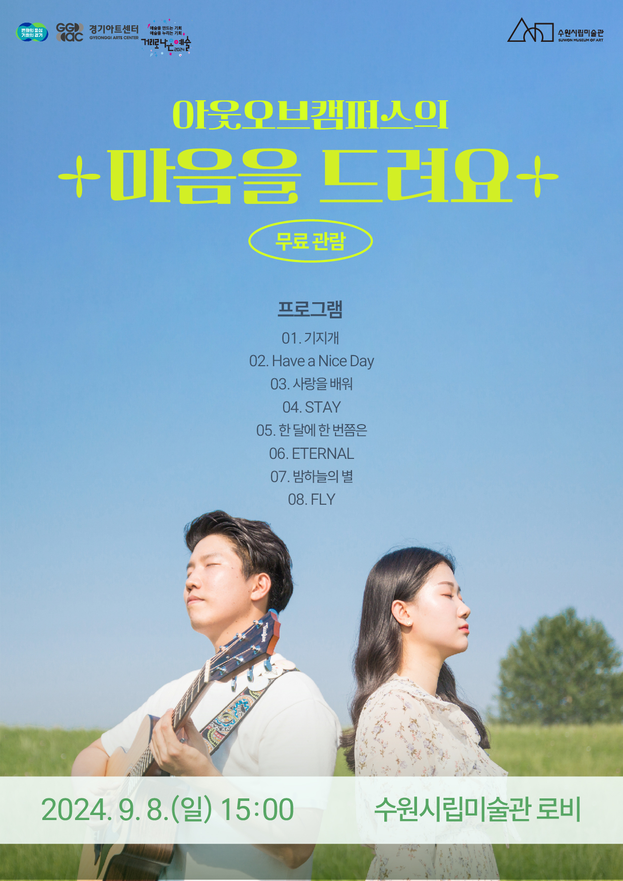 수원시립미술관에서 개최되는 이번 공연은 박정건, 정다솜 2인으로 구성된 어쿠스틱 듀오 ‘아웃오브캠퍼스’가 참여해 일상을 위로하며, 즐거움을 나누고자 '마음을 드려요'라는 주제로 개최된다.