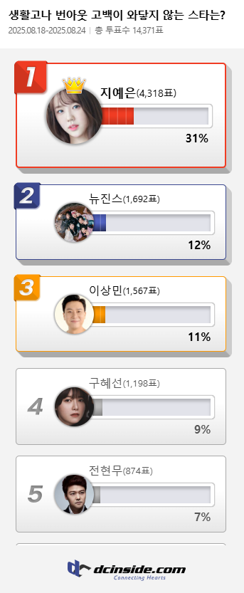 커뮤니티 포털사이트 디시인사이드(대표 김유식)가 '생활고나 번아웃 고백이 와닿지 않는 스타는?`으로 투표를 한 결과 지예은이 1위에 올랐다. 이 투표는 지난 18일부터 24일까지 총 7일간 진행했다.