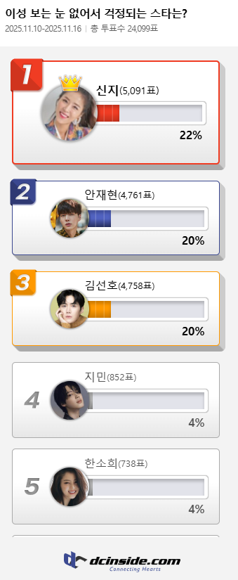 커뮤니티 포털사이트 디시인사이드(대표 김유식)가 `이성 보는 눈 없어서 걱정되는 스타는?`으로 투표를 한 결과 신지가 1위에 올랐다. 이 투표는 지난 10일부터 16일까지 총 7일간 진행했다.